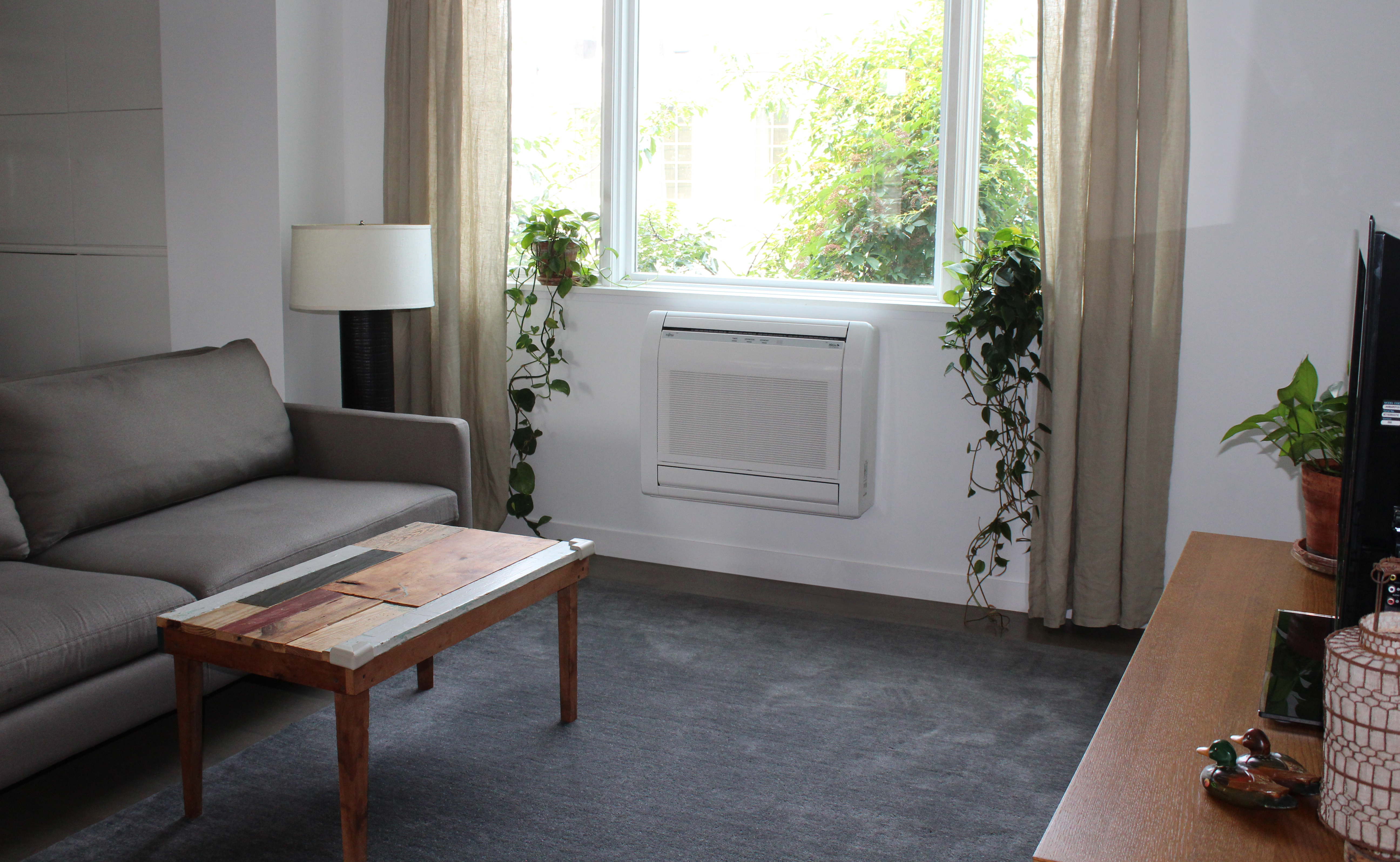 Modern air conditioner installed in the living room of an apartment.